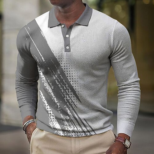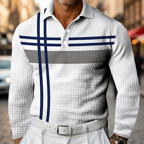 Per uomo Geometrico Linea Magliette Polo a Nido d'Ape Manica Lunga Magliette polo Camicie con Colletto Casual Abbigliamento quotidiano Bottoni Primavera Autunno Inverno Bianco Blu Grigio chiaro