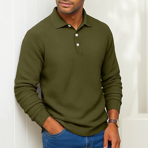 Per uomo Magliette Polo a Nido d'Ape Testurizzato Formale Affari Colletto Polo a Coste Manica Lunga Moda Essenziale Tinta unica Bottoni Puro Autunno Primavera Autunno Vestibilità regolare Nero