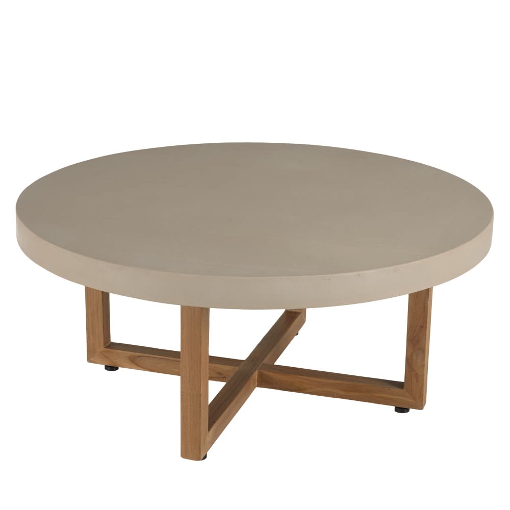 Table basse ronde 92x92cm en béton beige pieds croisés en teck D92