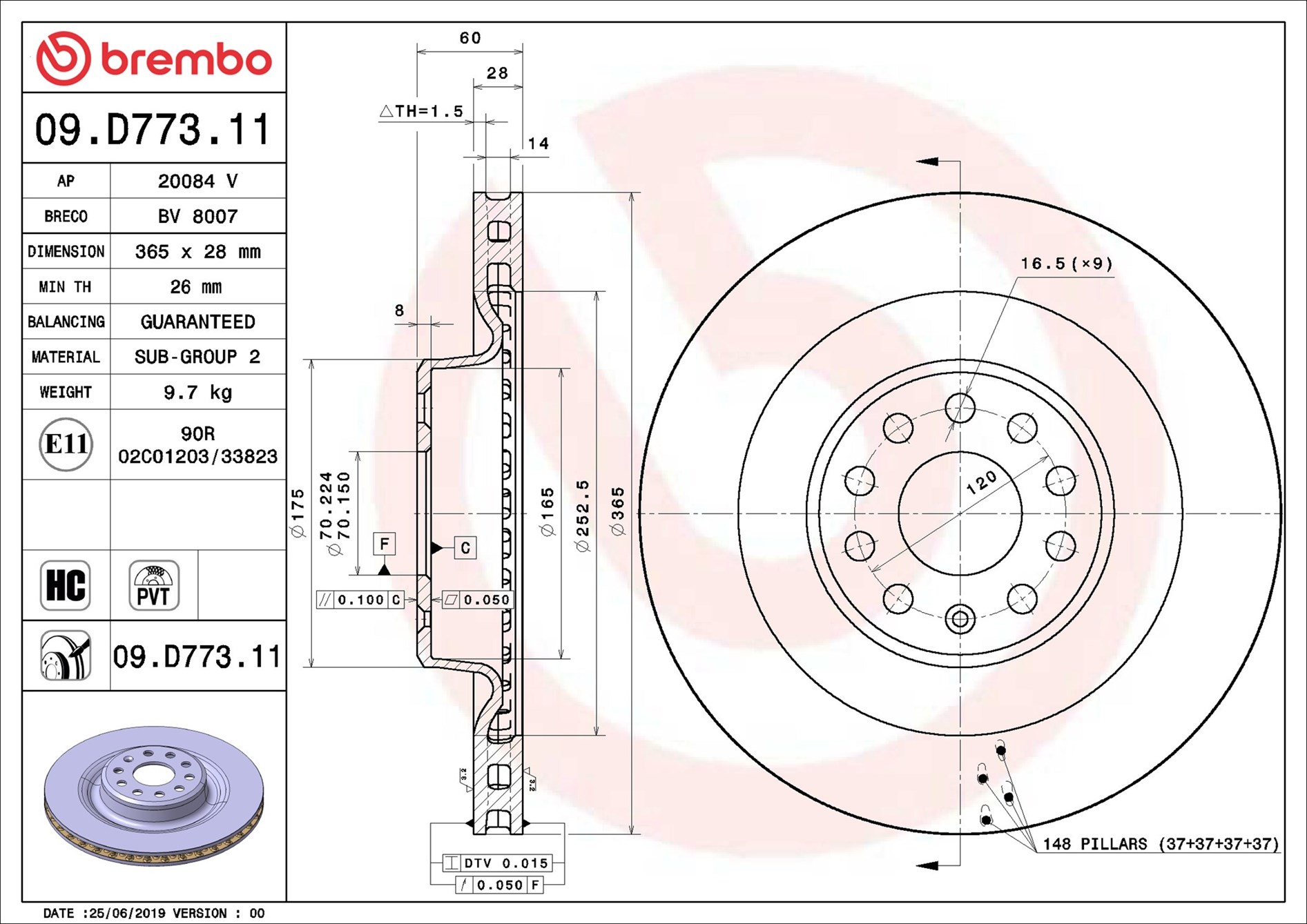 BREMBO Bremsscheibe COATED DISC LINE 09.D773.11 vorne rechts links innenbelüftet 365mm für TESLA 102763200B