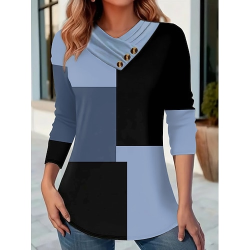 Per donna Maglietta Grafico Geometrico Blocco di colori Vintage Elegante Casual Manica Lunga Scollo a V Top Regolari Quotidiano Weekend Bottoni Stampato Blu Viola Verde Cachi Autunno Inverno
