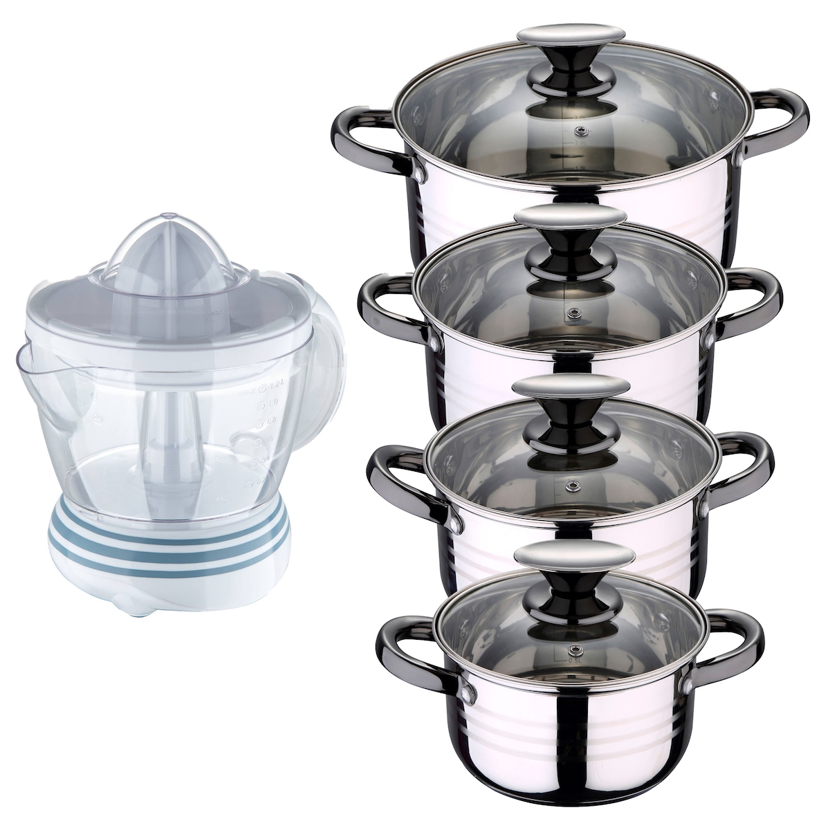 BERGNER - DINA 8-teiliges Kochgeschirr-Set (16/18/20/24cm) aus Edelstahl, induktionsgeeignet, mit NATURALLY 40W 1,2L Entsafter