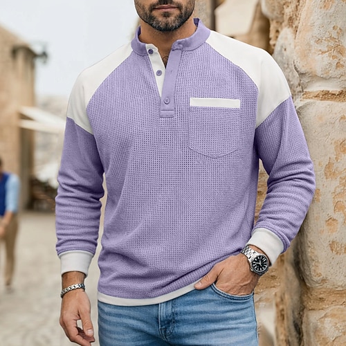 Per uomo Maglietta Waffle Maglietta Maglia Henley a nido d'ape Manica Lunga Henley Autunno Tutte le stagioni Tinta unica Testurizzato Casual Tasche Casuale Casa All'aperto Blu Rosso Blu marino