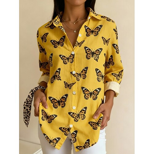 Per donna Camicia Farfalla Elegante Casual Manica Lunga Colletto a Camicia Top Regolari Lavoro Quotidiano Ferie Bottoni Stampato Giallo Estate Primavera Autunno