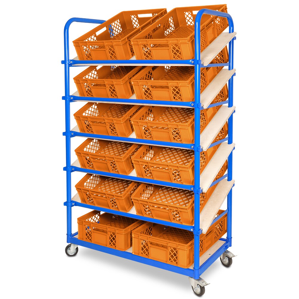 BRB Schrägboden-Regalwagen mit 6 Ebenen, bestückt mit 12 Euroboxen BxTxH 600x400x150 mm durchbrochen, BxTxH 1050x500x1690 mm (orange)