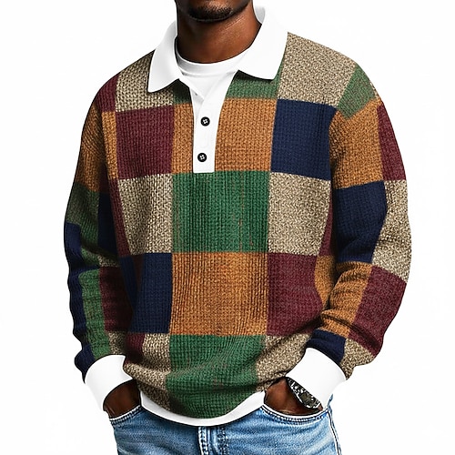 Per uomo Plaid Blocco di colori Magliette Polo a Nido d'Ape Manica Lunga Magliette polo Bavero Abbigliamento Sportivo Casual Scuola Athleisure Abbigliamento quotidiano Stampa 3D Primavera Autunno