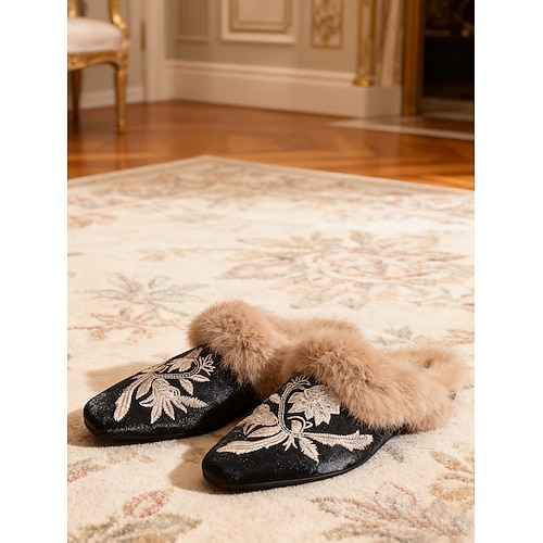 pantofole da donna con fodera in pelliccia ricamata rossa - design floreale in raso, comode pantofole slip-on per il comfort quotidiano, interno e invernale