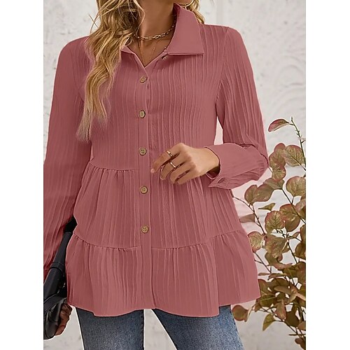 Per donna Blusa Tinta unica Elegante Casual Manica Lunga Colletto a Camicia Top Regolari Quotidiano Arricciato Bottoni Verde salvia Nero Rosso Blu marino Albicocca Primavera Autunno Inverno
