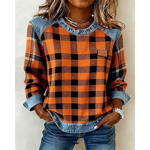 Per donna Felpa Pullover Plaid Blocco di colori Semplice Elegante Caldo Punk Manica Lunga Girocollo Top Regolari Casa Lavoro Streetwear Patchwork Stampato Giallo scuro Marrone chiaro Arancione