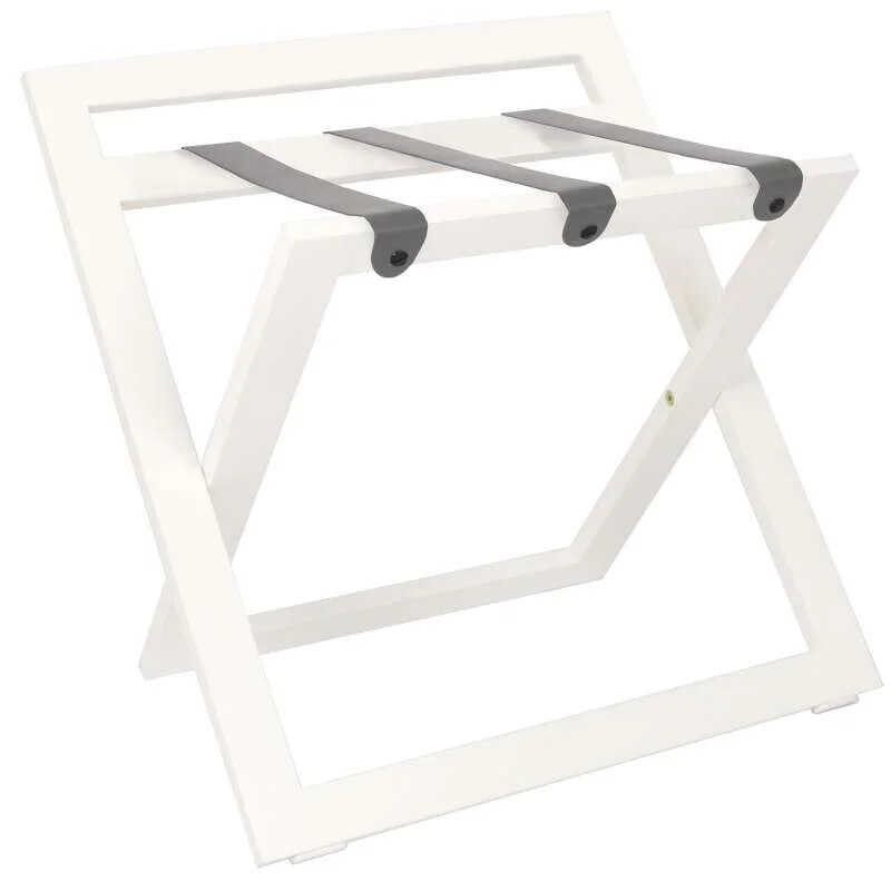 Kofferständer WOOD aus Holz mit Rückwand Buche Weiß mit Riemen Leder Grau