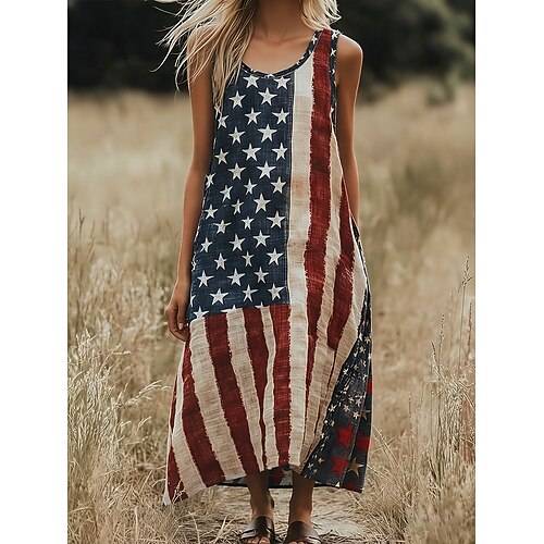 Per donna Abito lungo maxi Vestito Casual Abito Sottoveste Moda Essenziale Moderno Quotidiano All'aperto Spiaggia Vestibilità regolare Bandiera Americana Stelle e strisce Senza Maniche Girocollo