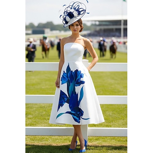 Linea ad A Lunghezza Tè Abito Derby Abito formale Elegante Senza Maniche Senza Spalline Formale Derby del Kentucky Raso con Stampa floreale