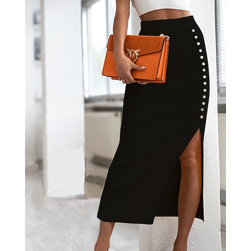 Per donna Gonna Casual Midi Vita media Gonne Semplice Con Spacco Elasticizzato Quotidiano Vacanza Aalbicocca Nero Bianco Giallo Estate Poliestere