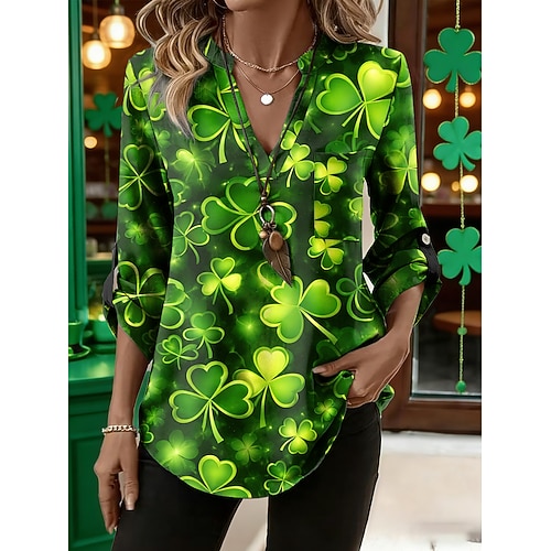 Festa di San Patrizio Per donna Camicia Grafico Trifoglio Vintage Quotidiano Elegante Manica Lunga Scollo a V Top Regolari Quotidiano Ferie Stampato Nero Bianco Estate Primavera