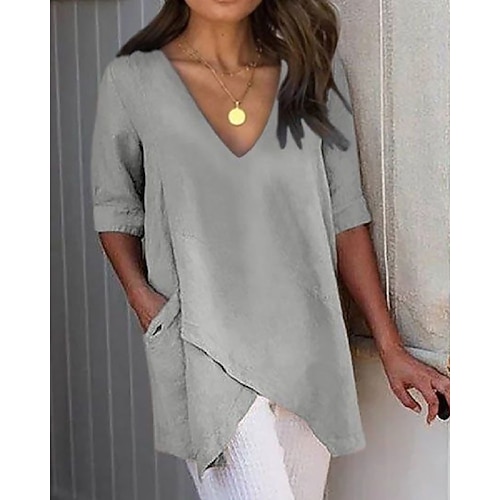 Per donna Camicie di cotone e lino Blusa Semplice Vintage Elegante Casual Mezza Manica Scollo a V Top Regolari Quotidiano Ferie Uscire Patchwork Asimmetrico Blu Giallo Arancione Verde Grigio Estate