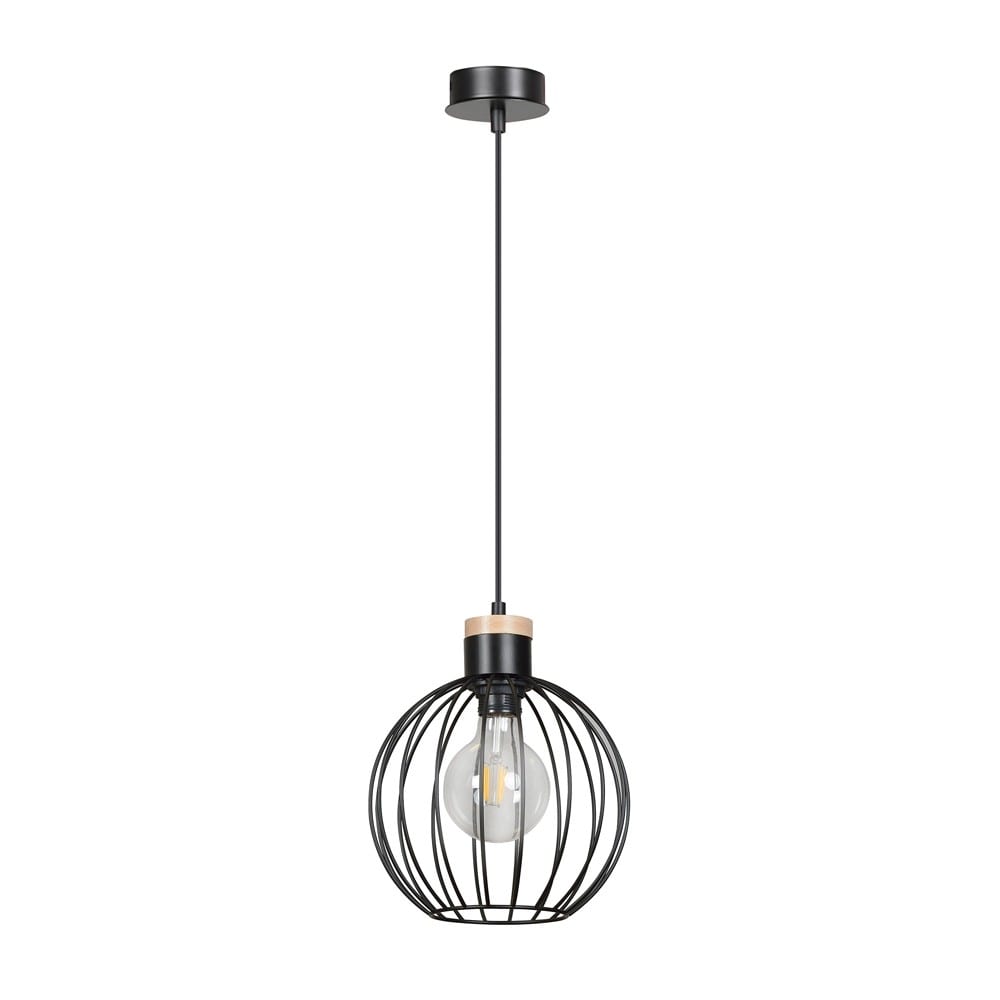 Lampada a sospensione con paralume in metallo nero e griglia in legno