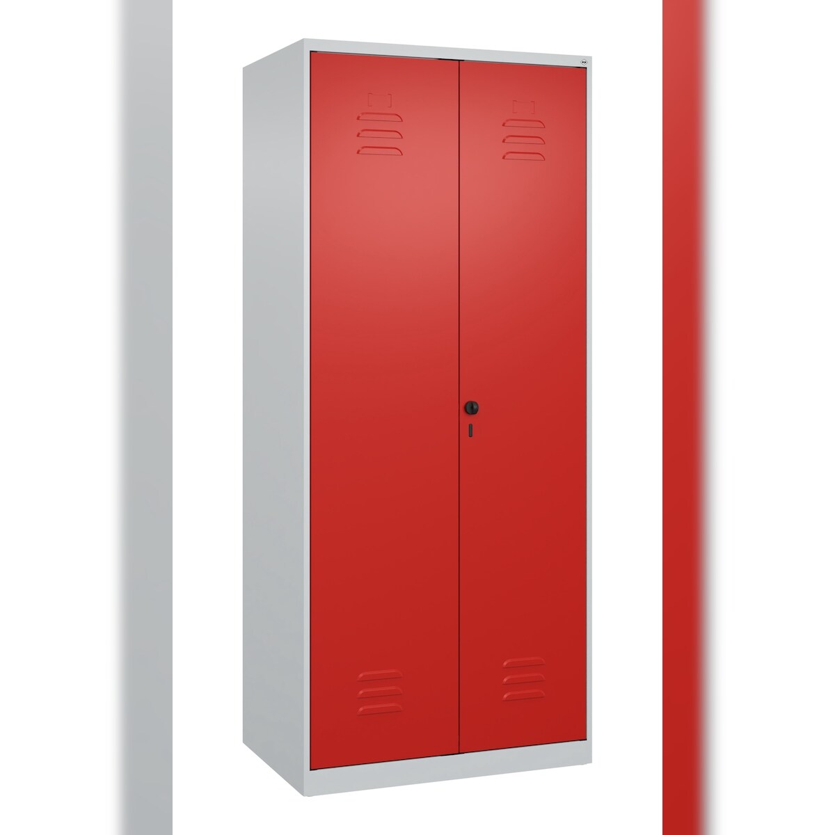 C+P Aufbewahrungs Doppel-Spind Classic PLUS, 2 Abteile je 4 Fachböden, HxBxT 185x80x50cm, Sicherheitsdrehriegel, Hellgrau/Rot von PROREGAL