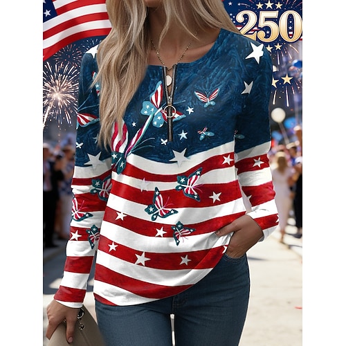 Giorno dell'Indipendenza Americana Per donna Maglietta Grafico Bandiera Americana Vintage Moda Casual Manica Lunga Girocollo Top Regolari Quotidiano Cerniera Stampato Blu Bianco Rosso Estate Primavera