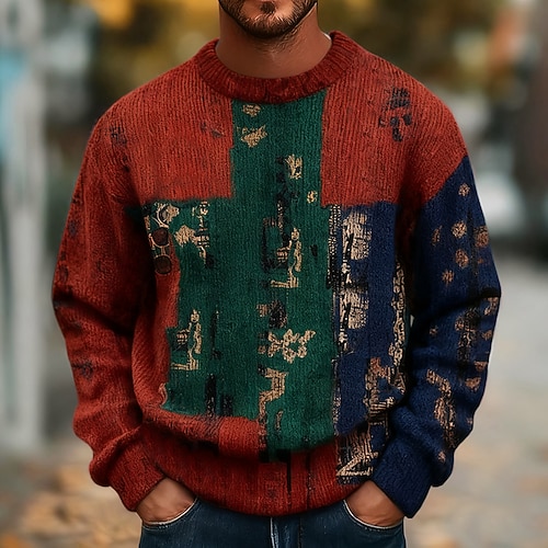 Per uomo Blocco di colori Maglione Maglieria Girocollo Casual Vacanza Streetwear Quotidiano Stampa 3D Lavoro a maglia Tenere al caldo Manica Lunga Primavera Autunno Inverno Rosso Blu Marrone