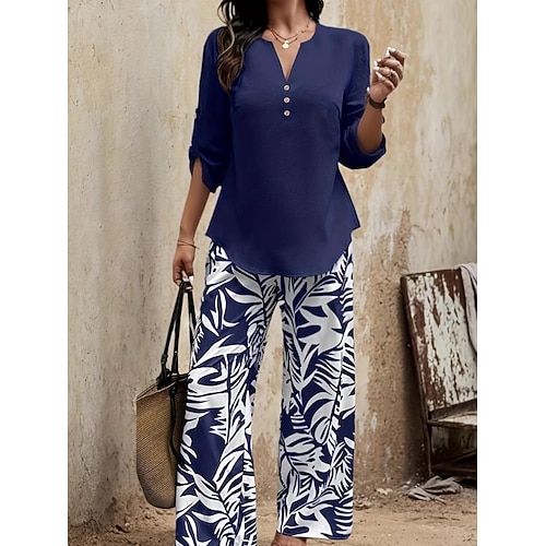 Per donna Moda Streetwear Set di Pantaloni Bolero Top Manica Lunga Scollo a V Foglie Casuale Quotidiano All'aperto Blu Primavera Vestibilità comoda