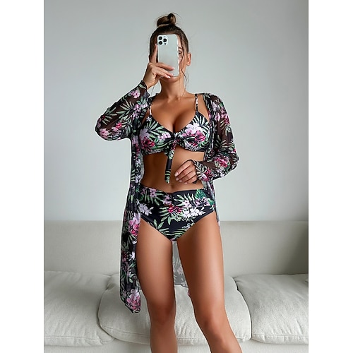 Costume da bagno bikini da donna 3 pezzi slip palmo slinguato senza schiena vacanza in spiaggia scollatura a V floreale senza maniche