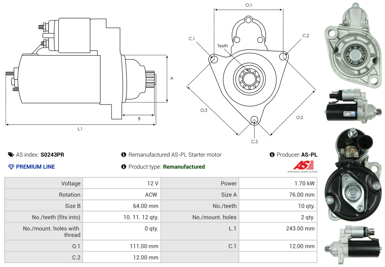 AS-PL Starter S0243PR 12V für VW 02M911024PX 02M911023NX 02M911024NX