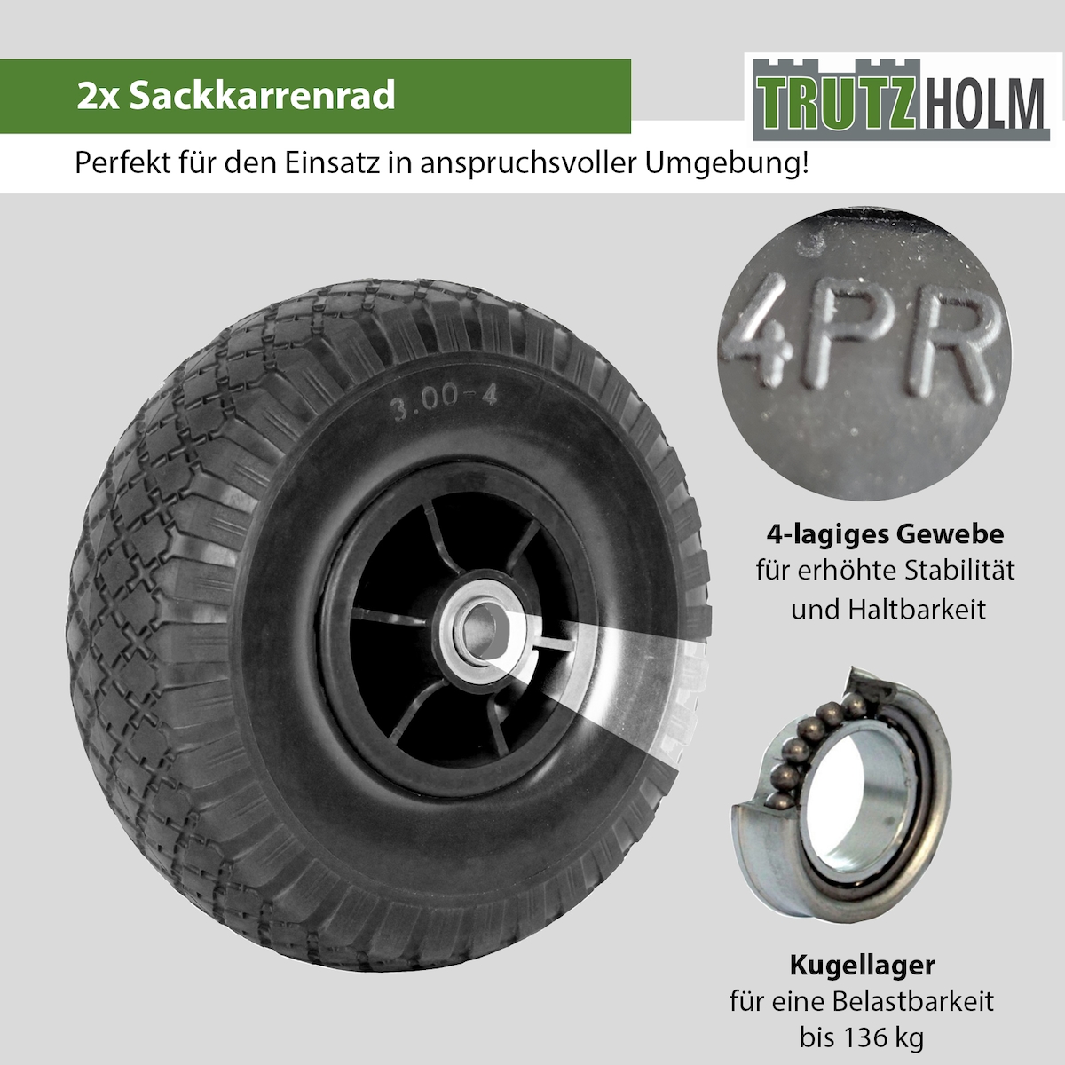 Baumarktplus 2x Sackkarrenrad Luftrad 260x85 mm 3.00-4 60 mm versetze Nabe Ø 20 mm schwarz robustes 4 PR Gewebe