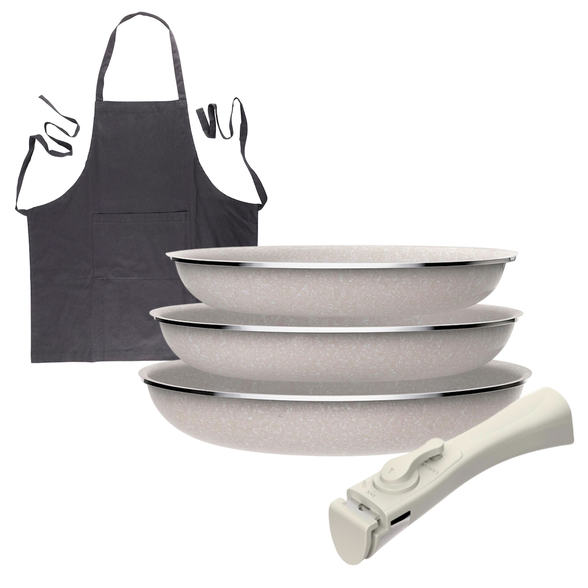 BERGNER - Set 3 Pfannen Ø18/20/24cm aus gepresstem Aluminium Antihaftbeschichtung mit abnehmbarem Griff mit Kochschürze Dunkelgrau 100% Baumwolle