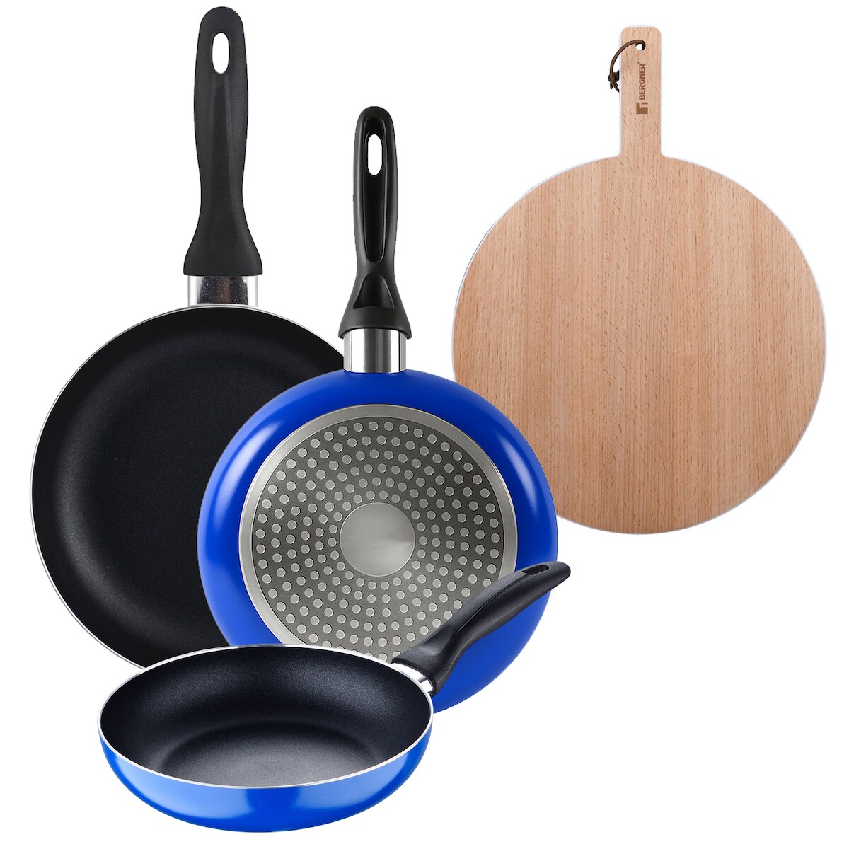 Bergner - Set aus 3 Pfannen Ø16/20/24cm aus gepresstem Aluminium für Induktion, Blue Navy Paradise, rundes Schneidebrett aus Buchenholz 38x28x1,5 cm