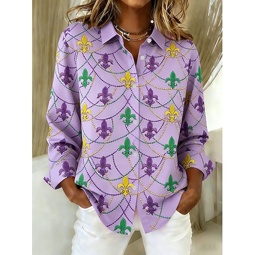 Carnevale Per donna Camicia Blusa Grafico Geometrico Astratto Vintage Elegante Casual Manica Lunga Scollo a V Colletto a Camicia Top Regolari Quotidiano Patchwork Bottoni Stampato Bianco Viola chiaro