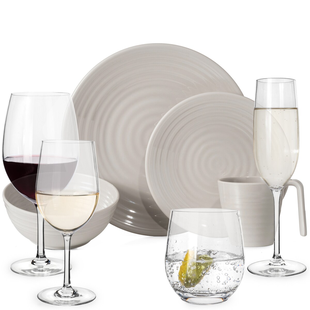 Moritz Melamin Geschirr Set 4 Personen Coffee 16 Teilig + 16 Tiamo Gläser Wassergläser Weingläser Champagner-Gläser Flûtes Tafelgeschirr Picknick BBQ Kochges