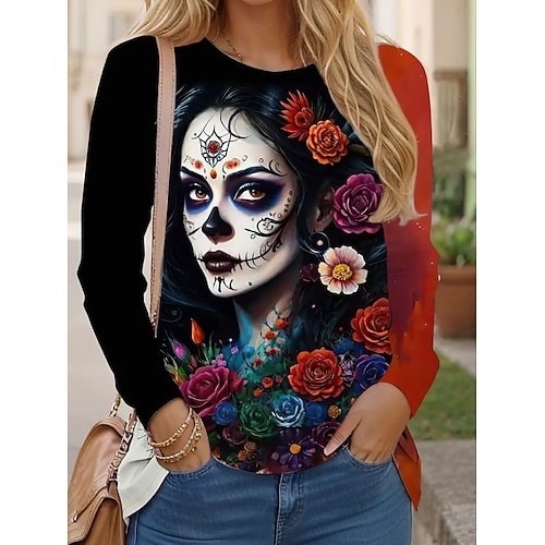 T-Shirt Donna Teschi Grafica Moda Casual Manica Lunga Collo Rotondo Top Regolari Stampa Quotidiana Weekend Rossa Estate Primavera Autunno