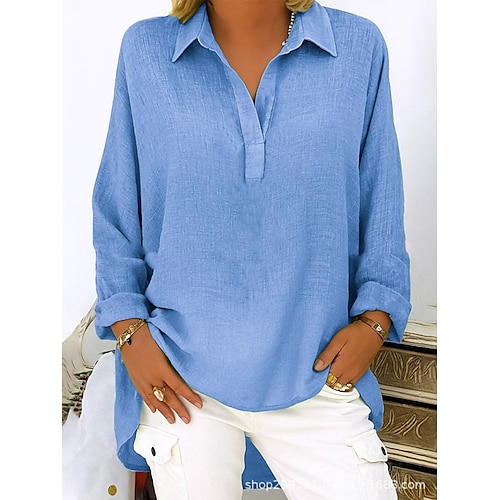 Per donna Camicie di cotone e lino Tinta unica Essenziale Casual Manica Lunga Scollo a V Top Regolari Quotidiano Rosa Blu Verde Grigio Estate Primavera Autunno