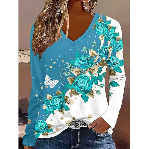 Per donna Maglietta Grafico Piante Vintage Elegante Classico Manica Lunga Scollo a V Top Regolari Quotidiano Stampato Blu Primavera Autunno Inverno