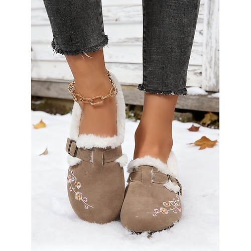 scarpe larghe da donna color cachi con fodera in pelliccia sintetica e ricami floreali – calde scarpe invernali slip-on con fibbia per casa, giardino e abbigliamento casual