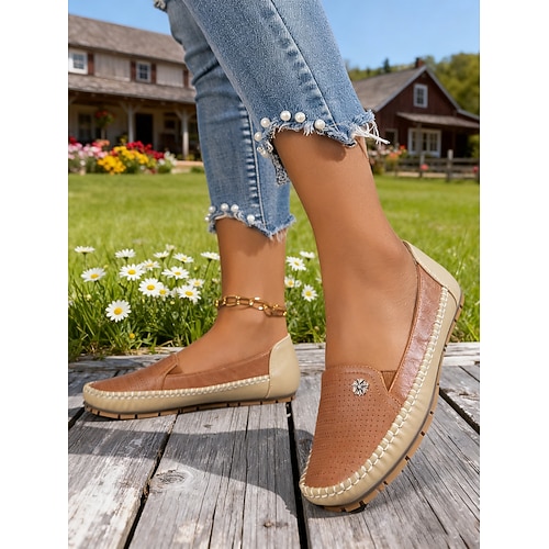 ballerine slip-on da donna color cammello traforate con contrasto in pelle e beige: comode scarpe casual estive per attività all'aperto, viaggi e uso quotidiano