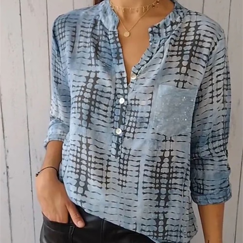 Per donna Blusa Top Eleganti Plaid Semplice Elegante Vintage Tropicale Manica Lunga Scollo a V Top Regolari Lavoro Quotidiano Ferie Arricciato Patchwork Tasca Blu Rosa Albicocca Grigio Estate