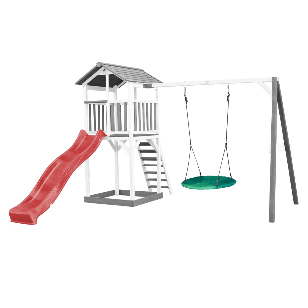 Parco giochi con arrampicata, scivolo rosso, altalena, bianco/grigio