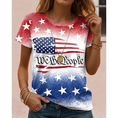 T-Shirt Patriottica da Donna Grafica Bandiera Vintage Elegante Classica Manica Corta Collo Crew Normale Top Quotidiano Weekend Stampa Nero Rosso Blu Estate