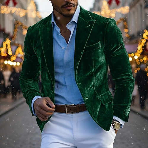 giacca blazer in velluto da uomo con chiusura a colletto, moda natalizia, festa, blazer tinta unita, rosso, blu, verde, vestibilità slim, monopetto, due bottoni