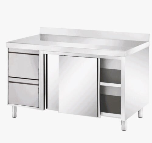 VM Europa Edelstahl Arbeitsschrank mit 2 Schubladen links, mit Zwischenboden - alle Größen montiert: 100 x 60 cm / mit Aufkantung / fertig montiert