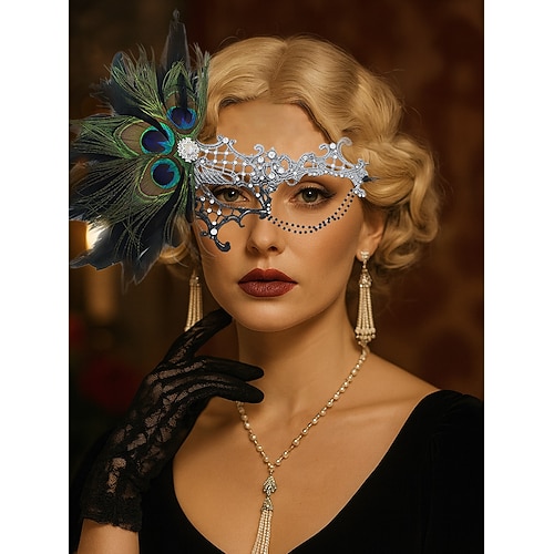 Maschera da donna in pizzo con piume verdi, dettagli di pavone e strass, accessorio per costume gotico vintage per la festa di Halloween