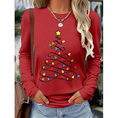 Maglietta da donna di Natale grafica vintage moda stilosa a maniche lunghe collo rotondo top regolari quotidiani weekend stampa bianca rossa autunno inverno