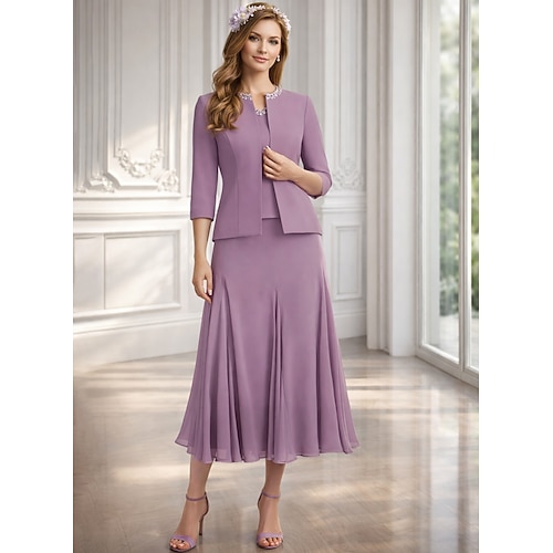 Due Pezzi Linea ad A Lunghezza Tè Abito da invitata a nozze Abito da cerimonia per signora Manica 3/4 Collo gioiello Elegante Ospite di nozze Festa di fidanzamento Chiffon con Perline