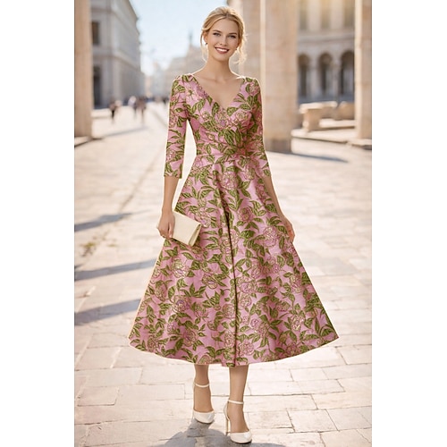 Linea ad A Lunghezza alla caviglia Abiti da Cocktail Elegante Vintage Manica 3/4 Scollo a V Formale Tasca Raso con Fiocco/Fiocchi Arricciato