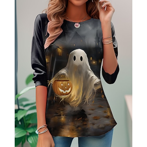 T shirt da donna alla zucca maniche lunghe grafica fantasma vintage elegante classica maniche lunghe collo rotondo top lunghi stampa quotidiana bianca rossa arancione primavera autunno prefestivo