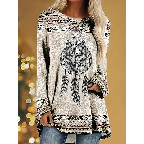 Per donna Maglietta Grafico Animale Tribale Vintage Elegante Classico Manica Lunga Girocollo Top Regolari Quotidiano Stampato Cachi Grigio Primavera Autunno