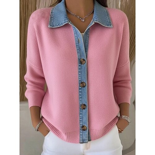 Per donna Felpa Elegante Vintage Colletto a Camicia Patchwork Manica Lunga Top Regolari Maglia Rosso bordeaux Rosa Autunno Inverno