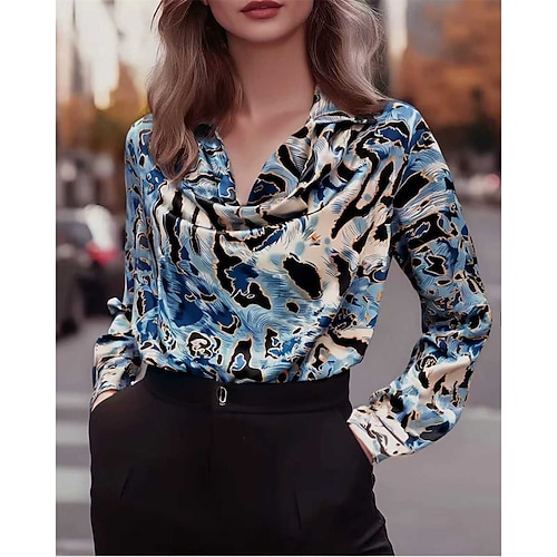 Per donna Camicia Elegant Raso/Satin Top estivi Grafico Semplice Elegante Vintage Signore Manica Lunga Scollo a Cascata Top Regolari Quotidiano Lavoro Ferie Arricciato Patchwork Stampato Blu Estate