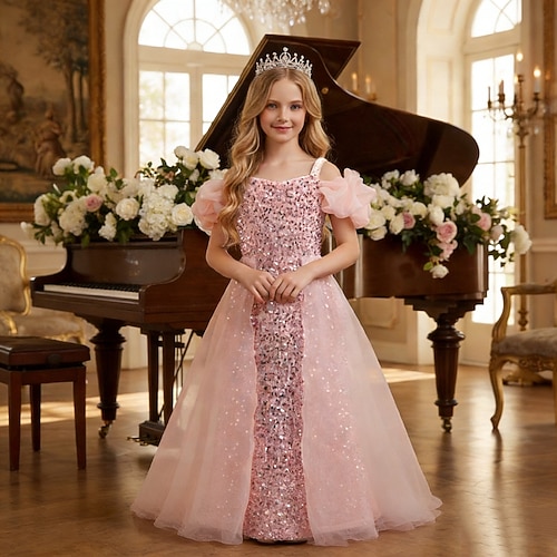 Abito da damigella d'onore bambina Ragazze Abito formale Abiti da sposa Feste Matrimonio Formale Elegante Moda Principessa Paillettes Tinta unica Senza Maniche Girocollo Blu Argento Dai 4 anni in su